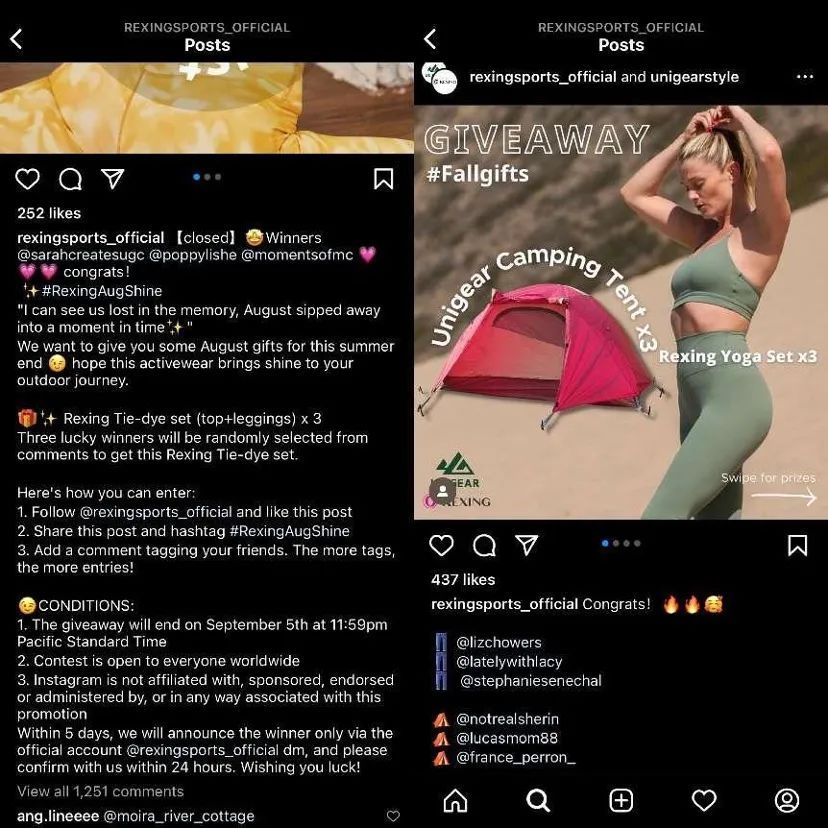 首先,Rexing 与户外运动类的小 KOL 合作,并将 KOL 的产品上身图发在自己的账号中,这种方式也很常见。第二,Rexing 会通过帖文发起有奖活动,一般用户需要做的就是关注、评论、转发贴文、打上规定的#标签或者在评论区@好友,获奖的用户可以获得 Rexing 的“bra+leggings”套装、购物卡等奖品。每次获奖的用户一般只有 1 个,但 Rexing 会较频繁地策划类似活动,通过多次的低成本活动来吸引更多用户参与。第三种方式,Rexing 会与户外运动品牌联动。比如,Rexing 在 9 月与户外运动设备品牌 UNIGEAR 合作为各自的品牌引流。之前,笔者在一个播客听到,海外很多规模较小、或者垂类品牌,会选择和目标受众有重叠、但彼此间非竞争关系的品牌“换量”实现增长。这种方式,相较于程序化广告投放,成本也相对更低一些。