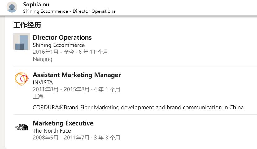 企查查信息显示,Rexing 创始人兼 CEO 为欧海芳(Sophia)。领英信息显示,Sophia 在创立 Rexing 前还有过 2 段职业经历。在知名户外服饰品牌 The North Face 负责中国市场的品牌和 PR。在北面之后,Sophia 去了全球知名综合纤维及聚合物公司英威达,在英威达,Sophia 负责杜邦面料的市场拓展及品牌传播。