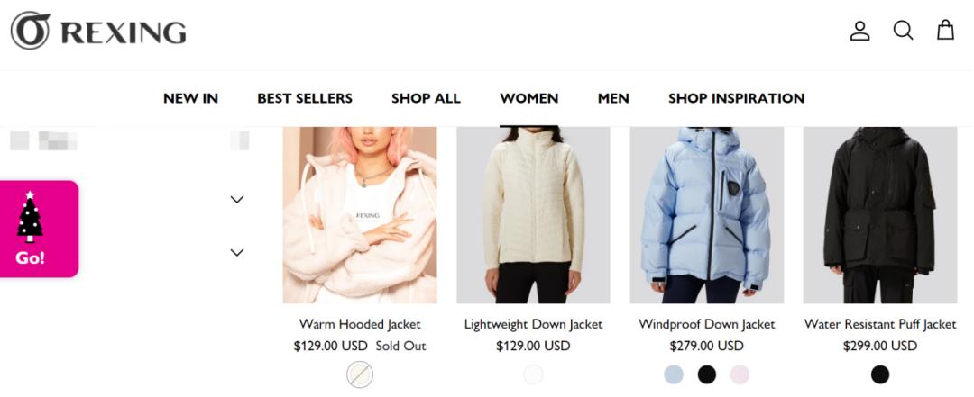 多数运动服饰品牌在打入市场时都会聚焦某个运动场景,通过打造爆款的方式建立品牌认知,比如 Baleaf 聚焦骑行,以一款带臀垫的骑行裤站住脚跟,比如 Halara 上线早期主推柔软、轻便的 Cloud9 面料系列,后来聚焦养宠场景解决养宠人士衣服粘毛的痛点。Rexing 则聚焦多个户外运动场景,越野跑、徒步、露营、户外瑜伽之类的运动。目前除了 leggings、运动胸衣等基础品类,Rexing 也推出了适用于户外活动的防风羽绒服、冲锋衣、防水夹克等品类。