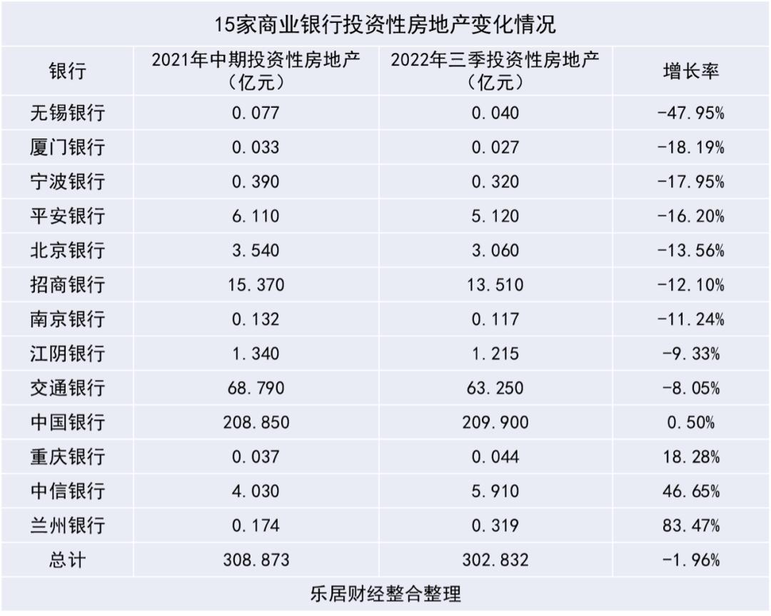 据乐居财经统计,今年三季度,13家样本银企中,有8家银行的投资性房地产比去年年中有所下降。其中,无锡银行最为典型,其该项指标,从770万元降至400万元,降幅为47.95%。