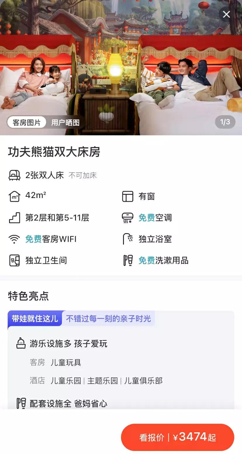 12月7日,飞猪显示功夫熊猫主题的房间售价3474起