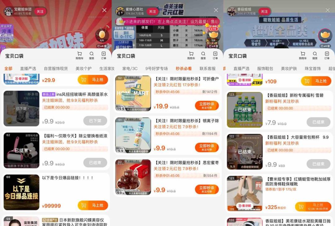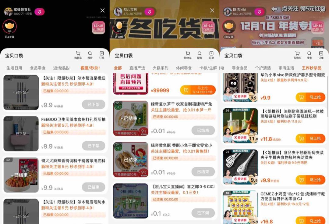烈儿宝贝坚持每天上线1元秒杀土鸡蛋,香菇来了每场直播雷打不动0.01元秒杀可乐,陈洁kiki的珍珠耳环双11当晚直接秒到19.9元……