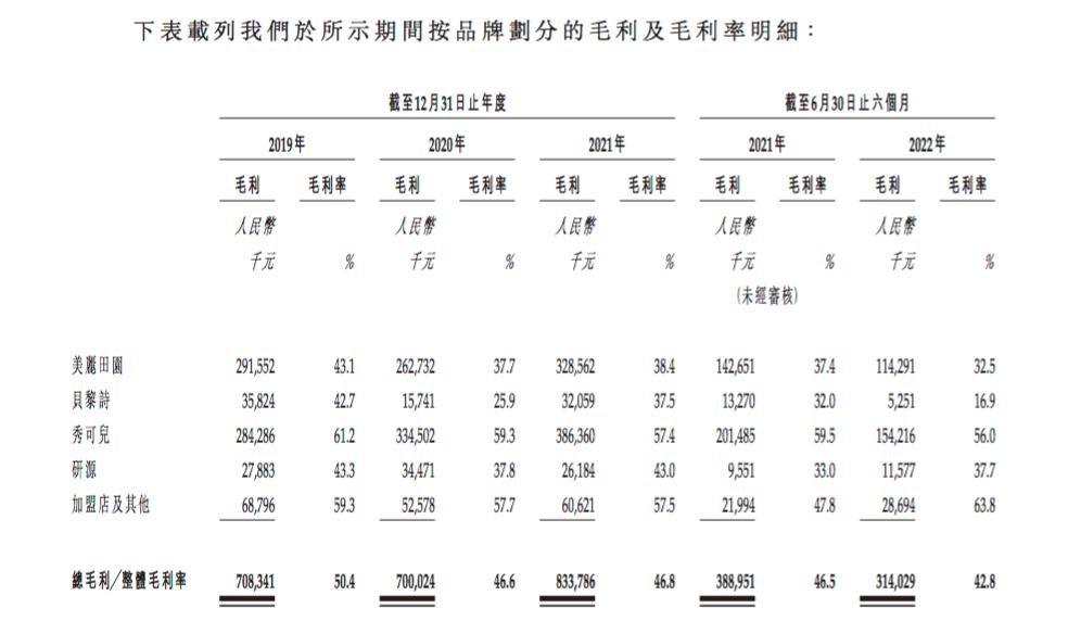 2019年至2022年上半年,美丽田园加盟店毛利率分别为59.3%、57.7%、57.5%、63.8%。即便加盟店及其他的毛利率有所增长,但是因其贡献有限,整体毛利率仍然创下新低至42.8%。