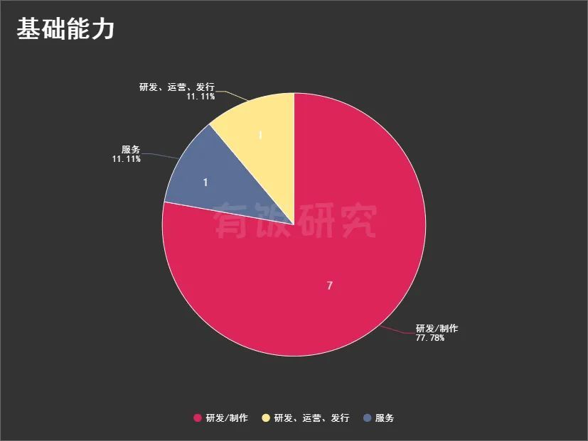 其基础能力上以研发/制作为主,共有8家,占比约89%。其中如心动网络同时兼具游戏产品的发行、运营和渠道服务能力,载艺星辉兼具二次元衍生品的IP运营、衍生品制作、销售等能力。