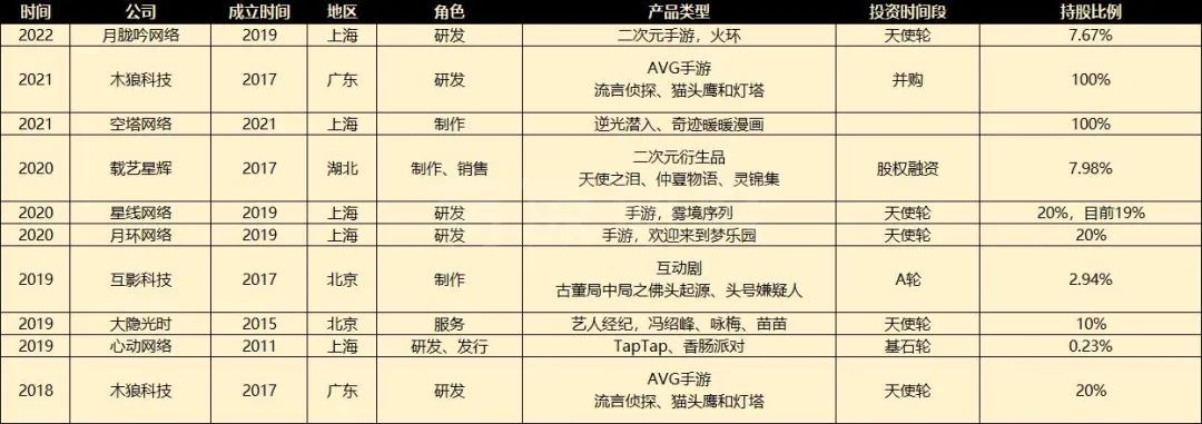 其中,最早的一次投资发生在2018年,对AVG游戏《流言侦探》研发商木狼科技的天使轮投资,投后持股比例约20%。最近的一次,是2022年1月对二次元手游《火环》研发商月胧吟网络的天使轮投资,目前持股比例约7.67%。