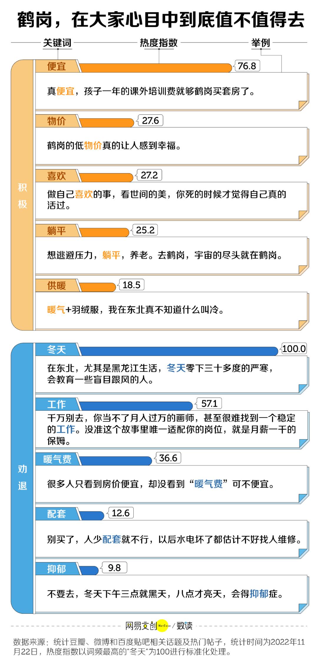 我们在微博、豆瓣和百度贴吧爬取了 7724 条相关评论,人们对鹤岗的想象离不开“房价便宜、物价低、生活躺平”,希望鹤岗的雪可以掩盖糟糕的原生家庭、内耗的恋爱与婚姻。