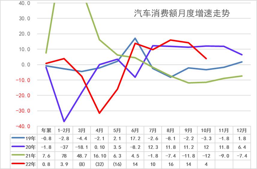由于今年6月开始的车辆购置税减征政策和2021年下半年基数偏低,2022年6-10月的汽车消费额增长10%左右,并拉动1-10月中国汽车消费增长0.8%,恢复正增长。 即使受到近期疫情冲击,但仍效果良好,预期全年将实现正增长。