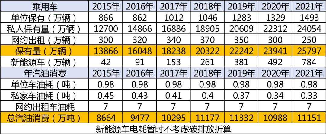 简单测算单位用车保有量和私家车保有量以及出租网约车保有量,测算其平均油耗,随着网约车的电动化加速推进,乘用车汽油车油耗持续下降,2021年已经体现油耗低于2018年峰值的特征,未来的乘用车汽油油耗必然持续减少,乘用车油耗的峰值已过,碳达峰目标基本实现,后面就看电力的绿色低碳化的进程了。