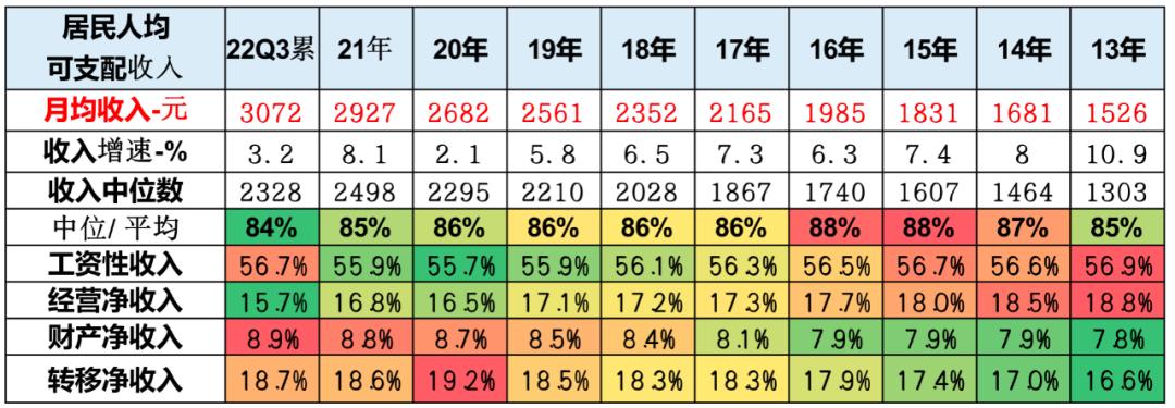 从本世纪初入世以来,中国居民收入不断快速增长,到2021年已经达到月均2927元,今年前三季度又达到3072元水平。 其中高收入群体的占比在逐步提升,尤其是从2017年开始,高收入群体的表现日益的突出,2022年前三季度中位收入达到平均收入84%的低位水平,这体现出高收入群体对收入的拉动效果相对突出。