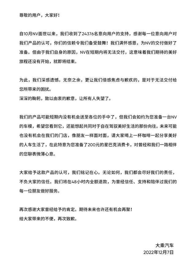 自游家也抱着这一想法,在12月7日自游家公布的无法交付告知信中就可见一斑。该信落款并非“自游家”,而是一家名为“大乘汽车”的汽车制造商。