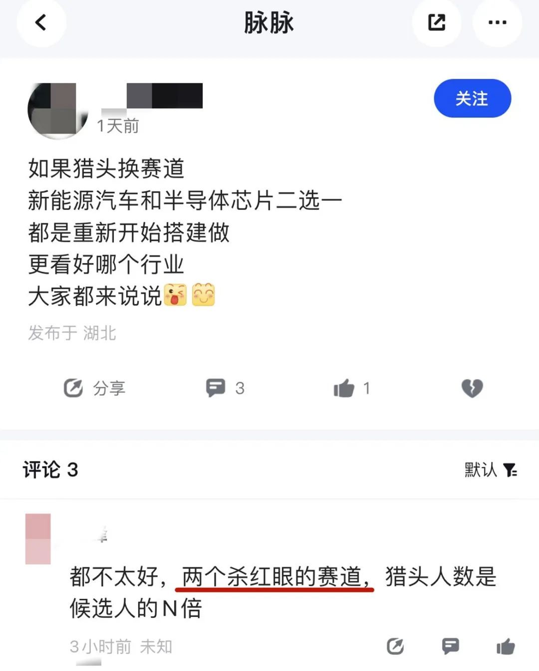 在脉脉上,甚至有不少人力资源从业的网友,都在咨询从传统行业向新能源汽车、芯片领域猎头转行的可能性。