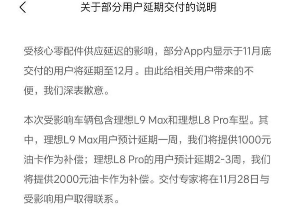 11月27日,理想承认受核心零配件供应延迟的影响,部分APP内显示于11月底交付的用户将延期至12月。10月26日,AITO 汽车官方今日发布《关于 AITO 问界 M7 车型部分用户的延迟交付积分补偿通告》。6月,零跑汽车被爆最长15个月不交车。2月,小鹏汽车被爆延期2个月以上,P7交付时间从4-5周增加至2-3个月。