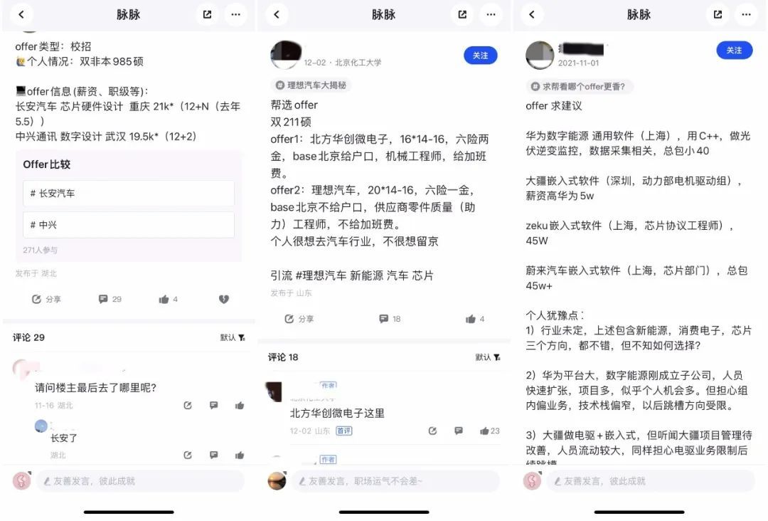 但在脉脉上,网友咨询的新能源车企薪资基本上都在平均水平线之上。