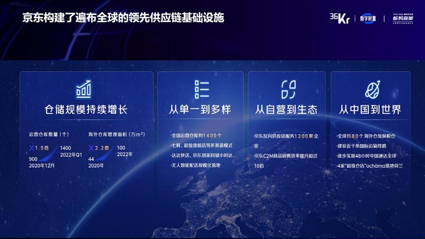 在仓储方面,京东目前运营的包括43座亚洲一号在内的遍布城乡的1400个仓库,仓储总面积已经超过了2500万平方米,在全球布局了80多个海外仓,4座超级仓店已经落地欧洲腹地,从交通运输方面已经完成了全球干线运输布局,开通了数千条海外线路。