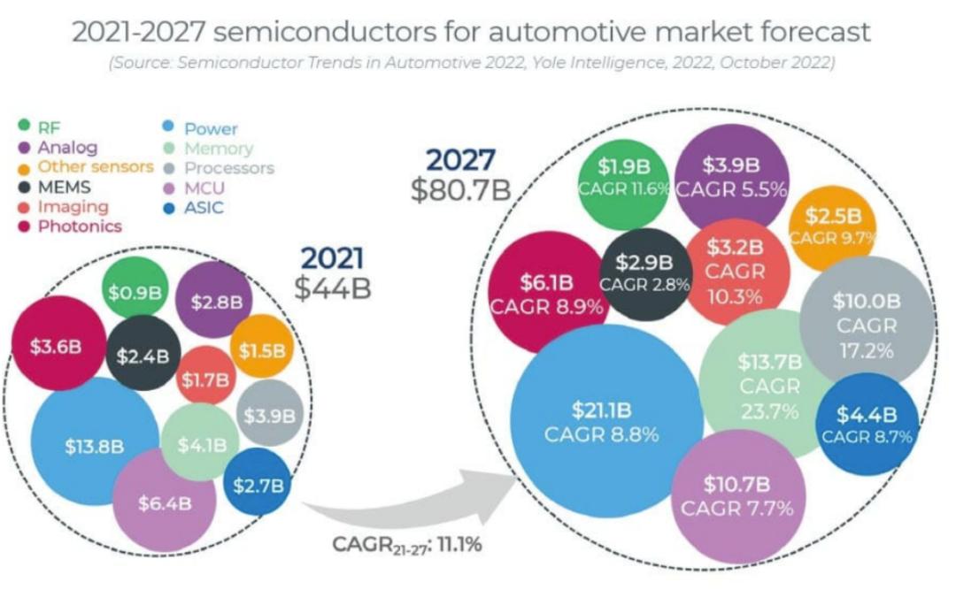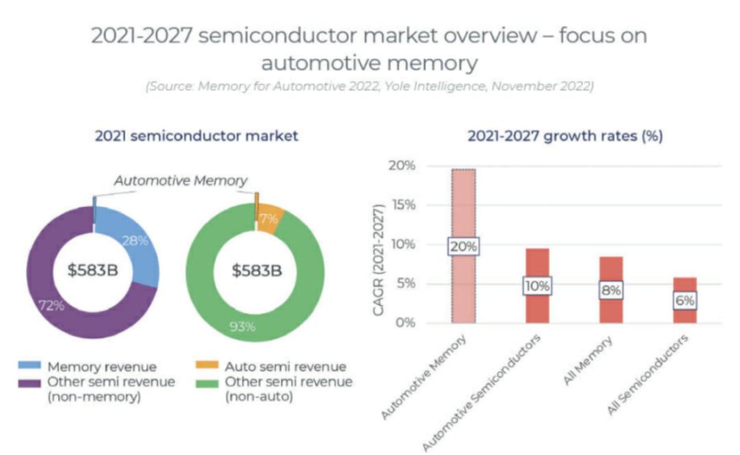 但是 Yole 预测到 2027 年汽车存储器的收入将增加两倍,占汽车半导体市场的 17%,2021到2027年的复合年均增长率为 20%,超过全球存储器市场同期的8% CAGR和汽车半导体市场同期的10% CAGR。