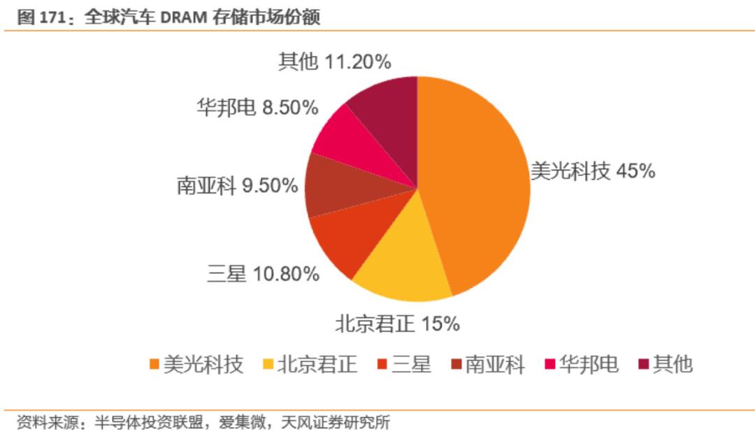 美光科技市占率近半地位稳固、技术领先,国内存储龙头北京君正DRAM市占率第二,三星、南亚科、华邦电紧随其后。从竞争格局来看,美光科技作为绝对龙头市占率达45%,2021年度进行了LPDDR5采样测试,为行业领先。北京君正收购北京矽成后进入车载存储芯片领域,已与博世汽车、大陆集团等下游车企达成紧密合作;汽车智能化程度的提高和相关技术的不断升级,也将带来除存储芯片之外的其他各类车载芯片的需求增长,北京矽成专注在汽车及工业领域的多年芯片研发经验将在智能驾驶时代迎来新的发展前景。