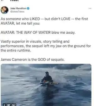 而在 Twitter 上,这部电影也基本获得了观众一面倒的正面评价。有很多人说它超越原作,无与伦比,甚至有不喜欢《阿凡达 1》的人对《阿凡达 2》赞不绝口。