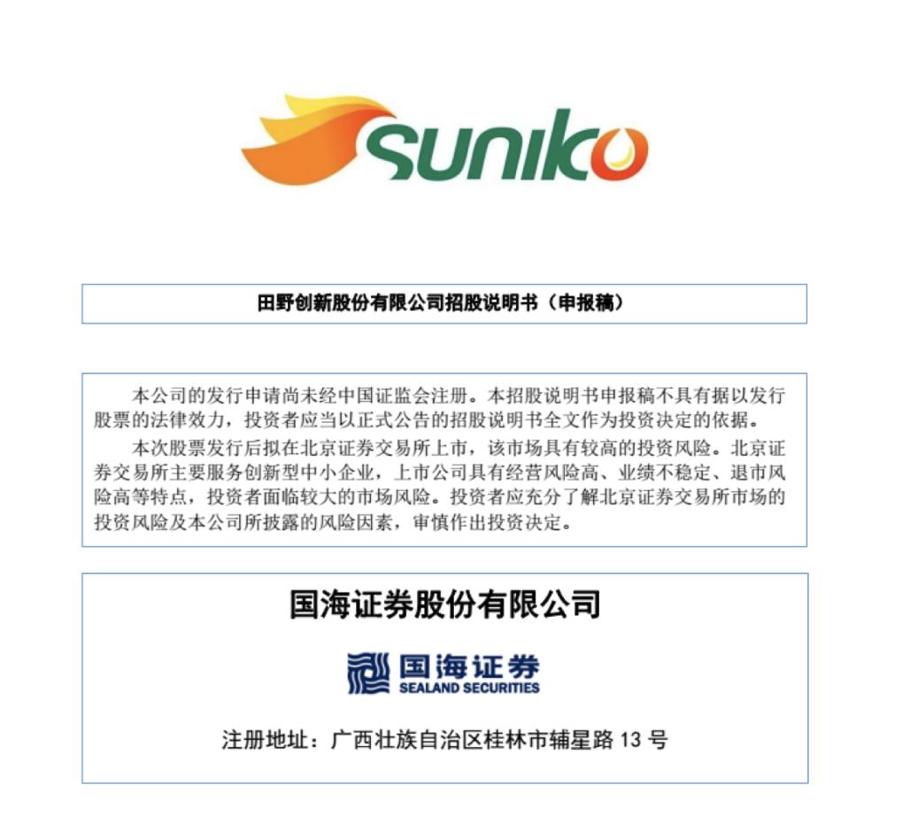 1月5日,田野股份向证监会申请辅导备案,辅导备案时申报板块为深交所主板,辅导机构为国海证券,直到3月,田野股份发布公告称,鉴于公司战略发展的需要,以及市场经营情况,在与辅导机构国海证券充分沟通的基础上,拟申请变更辅导备案板块为北交所。