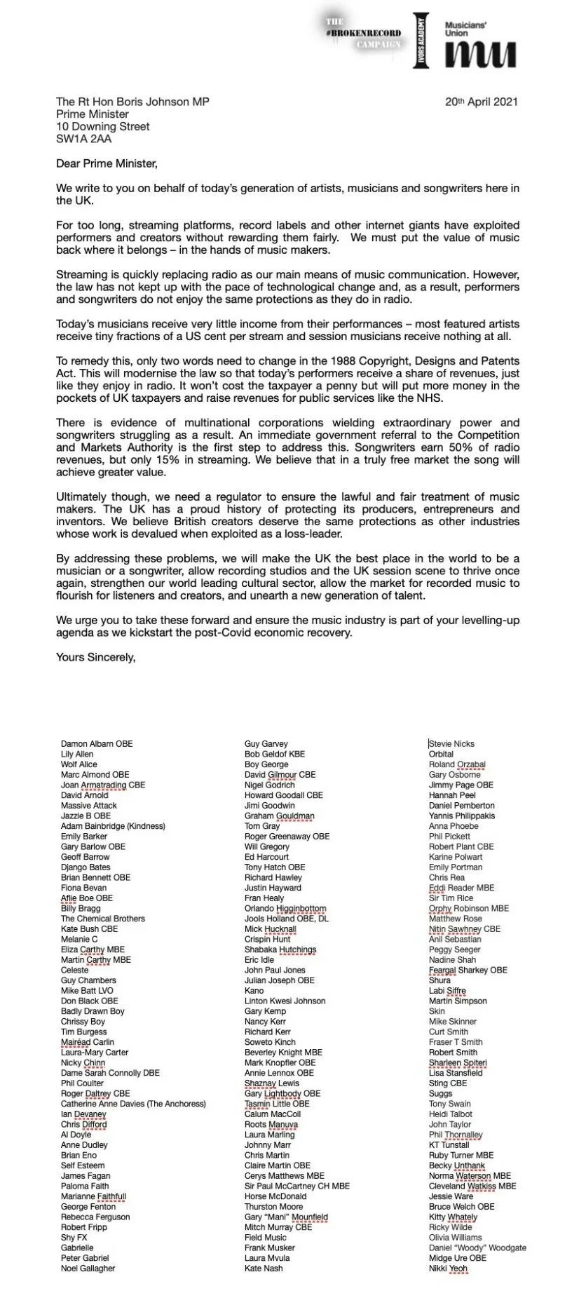2021年4月20日,一份呼吁政府对流媒体平台实施“公平报酬”的公开信被发送给时任英国首相的Boris Johnson。其中,还随信附上了150名的知名音乐人的签名声援,包括Paul McCartney、Coldplay乐队主唱Chris Martin、Sting、Led Zeppelin的成员Jimmy Page、Robert Plant、John Paul Jones等。