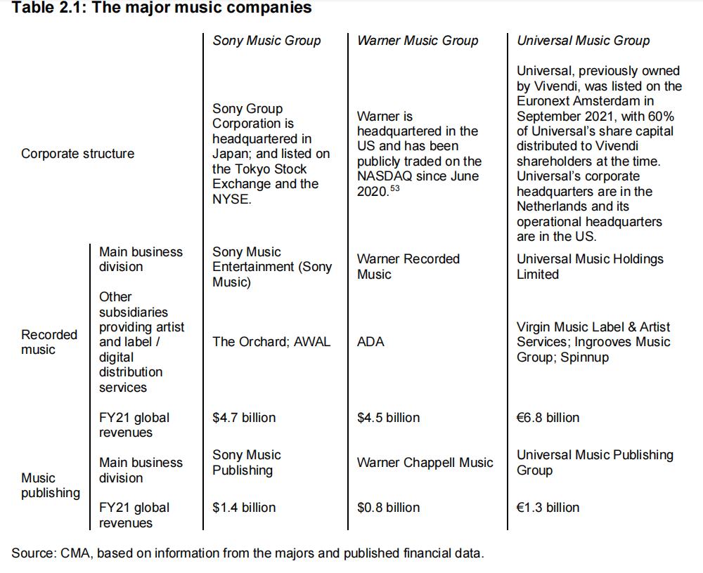 与此同时,CMA还对三大唱片的利润进行了分析,同样并没有“发现主要唱片公司持有大量和持续的超额利润的证据。”根据三大唱片提供给CMA的数据来看,三大唱片在Spotify上市后,华纳音乐卖掉了它购得的全部Spotify股权,索尼音乐卖了49%,并将收益用于支付音乐人的版税。环球虽然还持有Spotify的股权,但三大唱片都表示,他们并没有干预流媒体平台的经营,同时也没有从流媒体平台获得倾向性条款。