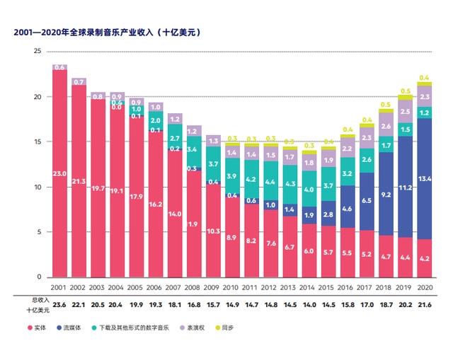 来自IFPI的《2021全球音乐报告》很好地说明了这个问题。自2001年以来,全球录制音乐产业的收入基本上没有增长,并且在2014年以前,全球录制音乐产业的整体收入一路下降。2015年流媒体快速兴起以来,全球录制音乐收入才再次稳步增长,这种增长建立在流媒体收入稳步增长、实体销售收入急剧下降的基础之上。2017年,流媒体的收入首次赶超实体唱片,并且流媒体的优势地位逐年递增,到了2020年流媒体的收入已经是实体唱片的三倍有余。