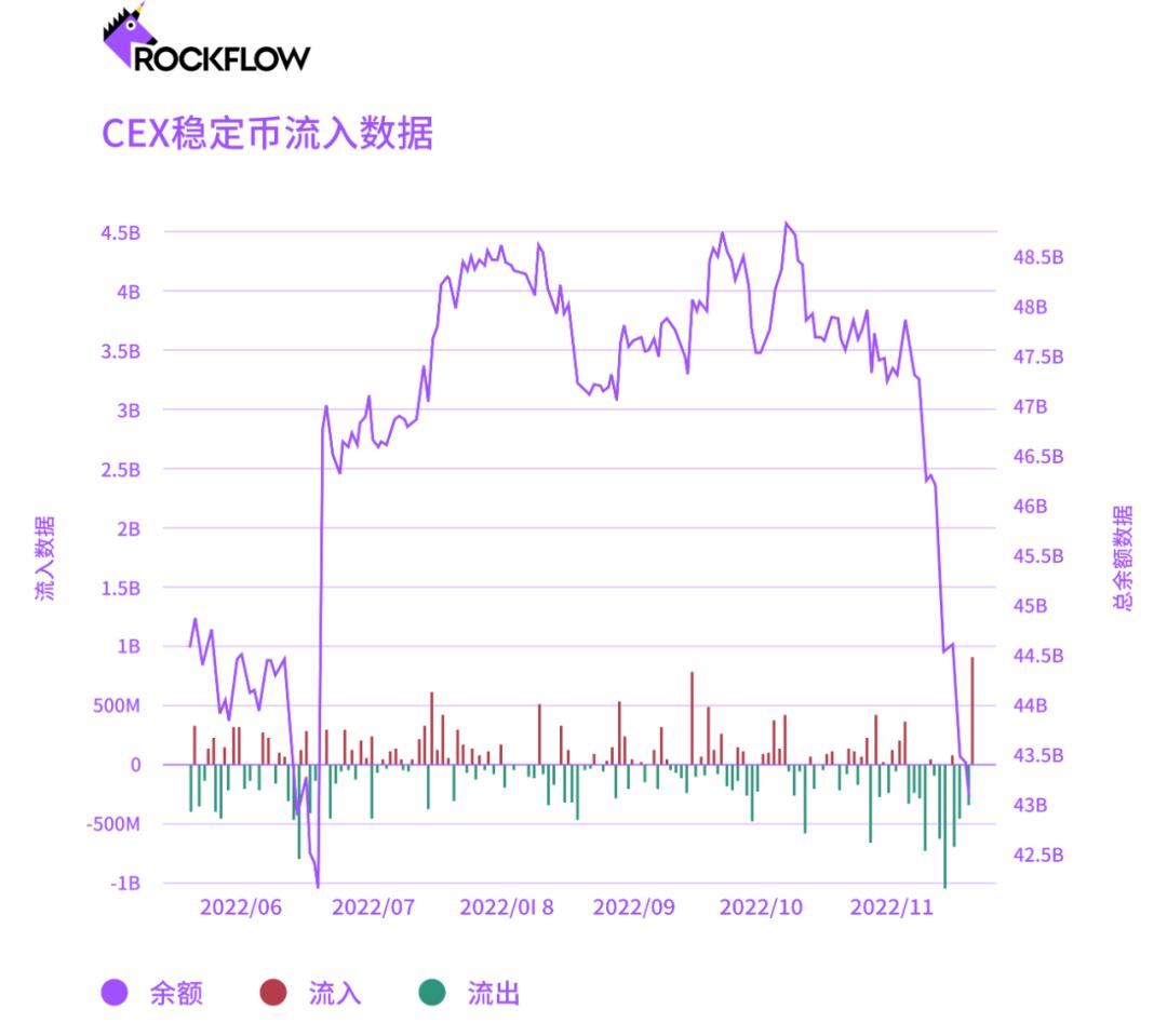 稳定货币也在遭遇同样趋势的流出。CEX内的稳定币从11月初近475亿美元到11月19日降至430.7亿美元,流失占比达到9.3%。