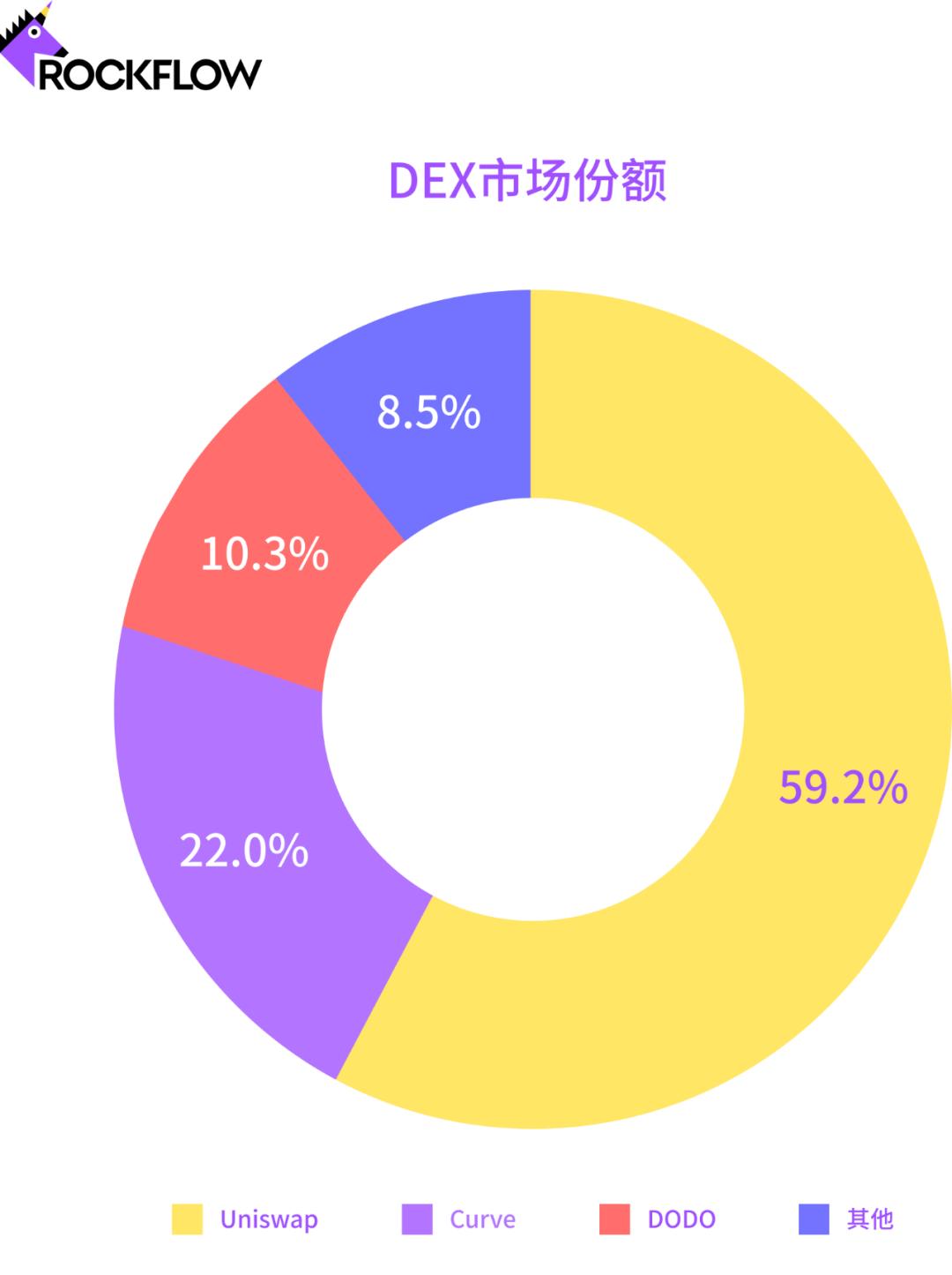 DEX有众多项目,却是一个集中度很高的细分领域,前三的玩家占了市场份额91%左右。其中,最大的是Uniswap,占市场份额59.2%,其次是Curve,占市场份额22.0%,第三名是DODO,占市场份额10.3%。
