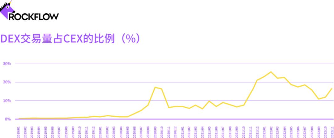 和CEX对比,2020年DEX只有CEX交易量的1%。今年FTX暴雷事件后 ,这一数字从9月的10%攀升到11月的16%,呈明显的上升趋势。