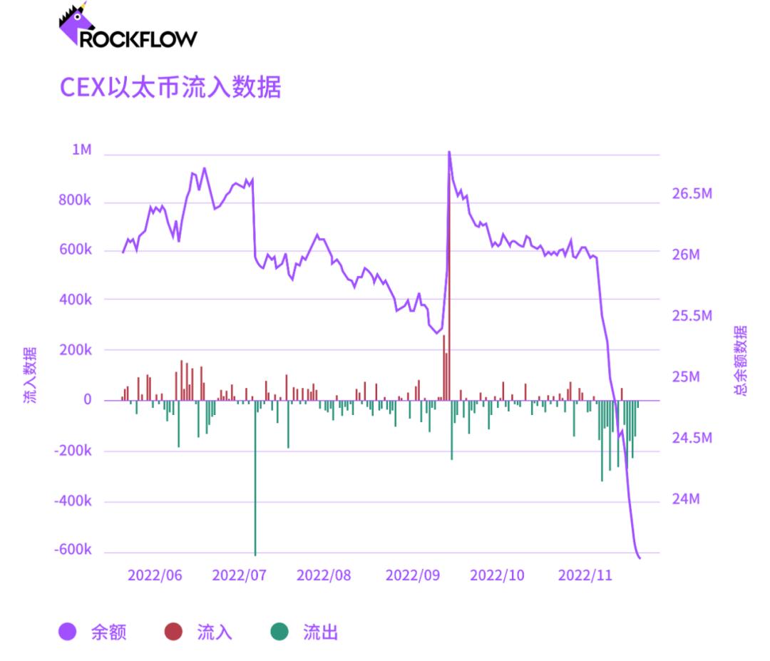 从链上数据可知,DEX在FTX暴雷后出现明显的增长趋势。用户将资金从CEX中取出存入自己的钱包,并更多使用DEX来进行交易。 作为主流加密货币的ETH,从11月初持续流出CEX,数量从11月初近2600万枚到11月21日降至2353万枚,流失占比达到9.5%。