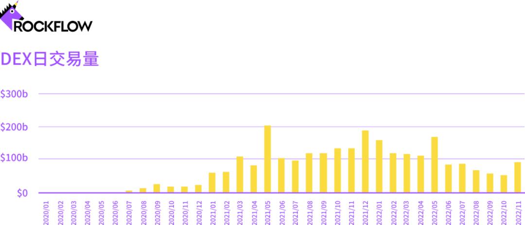 DEX从2020年开始崛起,历经2年多时间,总交易量已经非常可观。 从每月数据来看,2022年11月的交易量已达910亿美元,和2020年11月的160亿美元相比,增长幅度为460%。