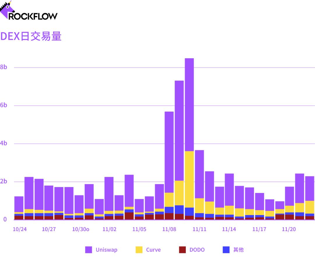 反观DEX,链上数据显示,DEX的交易量在11月8号开始猛增,一路攀升,在11月10日突破单日80亿交易量,是一个月前单日平均值的4倍多。其中Uniswap和Curve交易量明显增幅,说明用户从CEX更多转向Uniswap和Curve进行交易。
