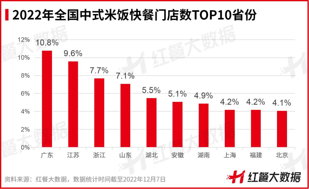 从省份分布来看,截至2022年12月7日,分布在广东、江苏这两大省份的中式米饭快餐门店最多,占比分别为10.8%、9.6%,其次是浙江省和山东省,门店数占比分别是7.7%、7.1%。