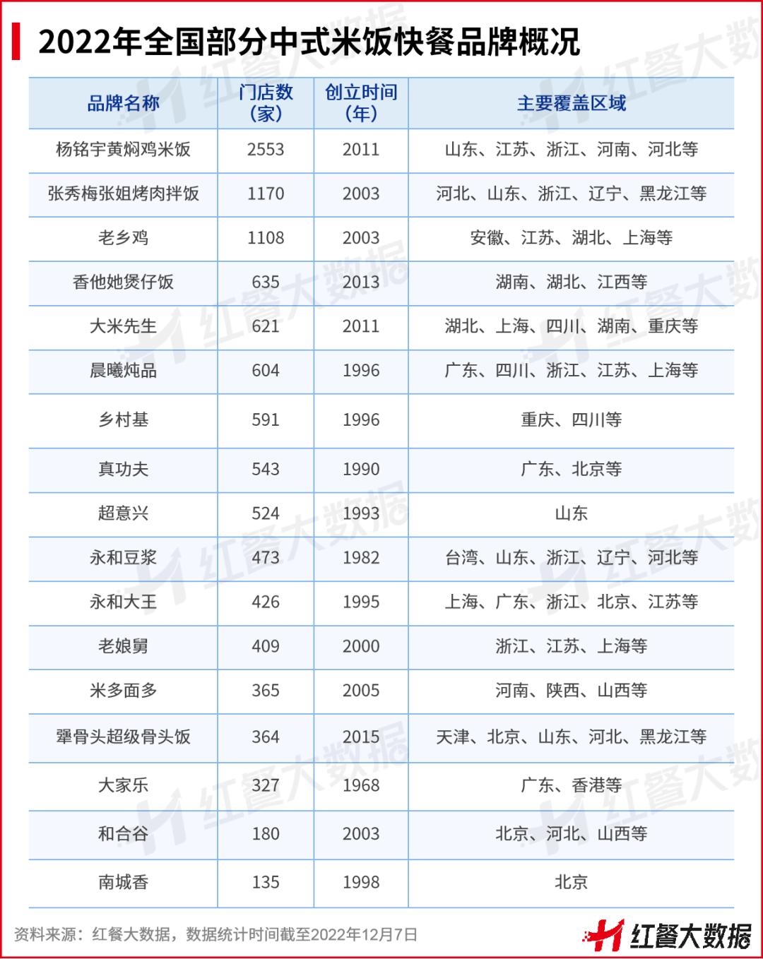 但是也有部分中式米饭快餐品牌实现了逆势扩张,比如大米先生、老乡鸡等。近年来,大米先生快速发展,截至2022年12月7日,其门店数已经达到了621家;老乡鸡亦加快了拓店步伐,先后入驻了深圳、北京等城市,目前其门店数为1100余家。