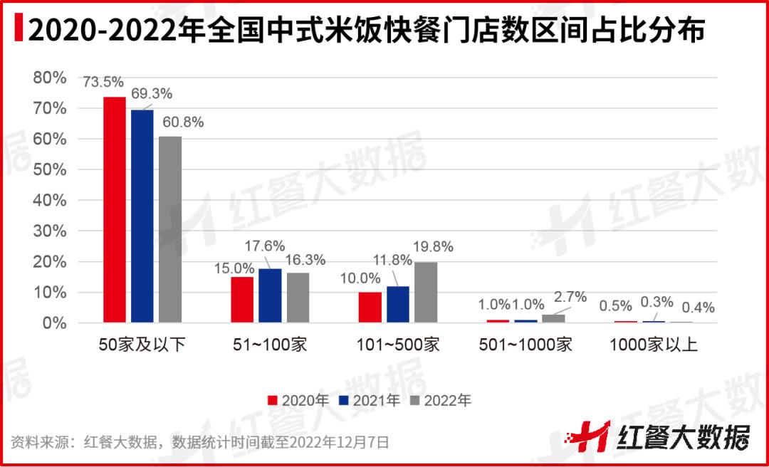 红餐大数据显示,2022年60.8%的中式米饭快餐品牌门店数在50家及以下;门店数在51到100家的品牌占比为16.3%;超过500家的品牌较少,占比仅有3.1%。