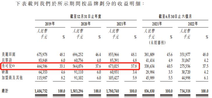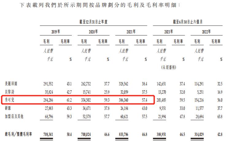在其招股书中可以看到,涉及轻医美业务的秀可儿在营收和毛利率上表现亮眼。从2019-2021年三年间,秀可儿在营收中的占比逐步提升,甚至在2020年-2021年间,秀可儿的毛利和毛利率高于美丽田园主业。