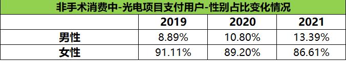 ▲2019-2021年非手术类项目性别占比变化情况,整体统计指标:支付用户数, 图/新氧数据颜究院提供