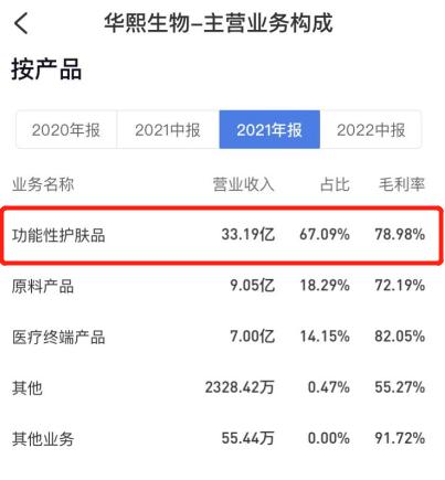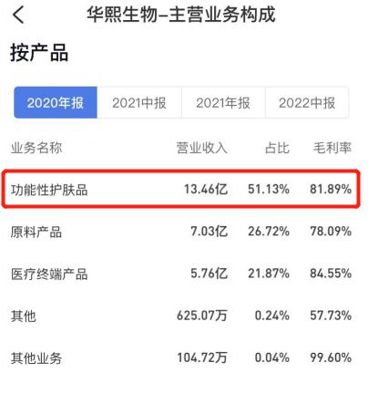 以上游医美产品生产商中的龙头华熙生物为例,作为产业链上游的原材料供应商,B端客户之外C端用户正在茁壮成长,翻阅华熙生物2020年、2021年全年财报可以看到,在营收贡献中,来自于功能性护肤品的占比从2020年的51.13%一路攀升至2021年的67.09%。