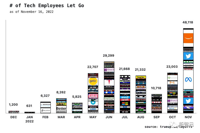 随着亚马逊加入裁员大军,网友纷纷在亚马逊推特下晒出2022年度各大厂裁员的统计图。