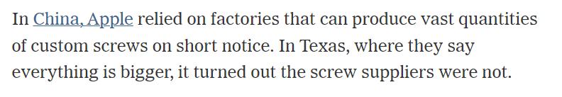 这篇文章的作者调侃到 “ 在中国,苹果可以依赖那些短时间就能生产大量螺丝钉的工厂,而在美国得克萨斯州这个号称什么都大的地方,他们发现螺丝钉工厂不够大 ” ( “ 德克萨斯什么都大 ” 是美国一个喜闻乐见的地域梗,就像中国的 “ 天津人大饼卷一切 ” 一样 )