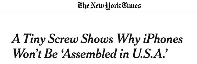 2019 年,纽约时报写过这样一篇文章,名字是 “ 一颗小螺丝告诉你为什么 iPhone 不会在美国组装 ”。