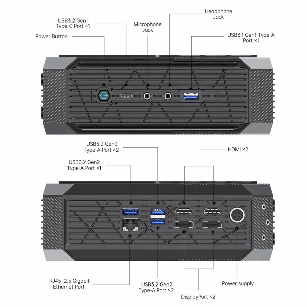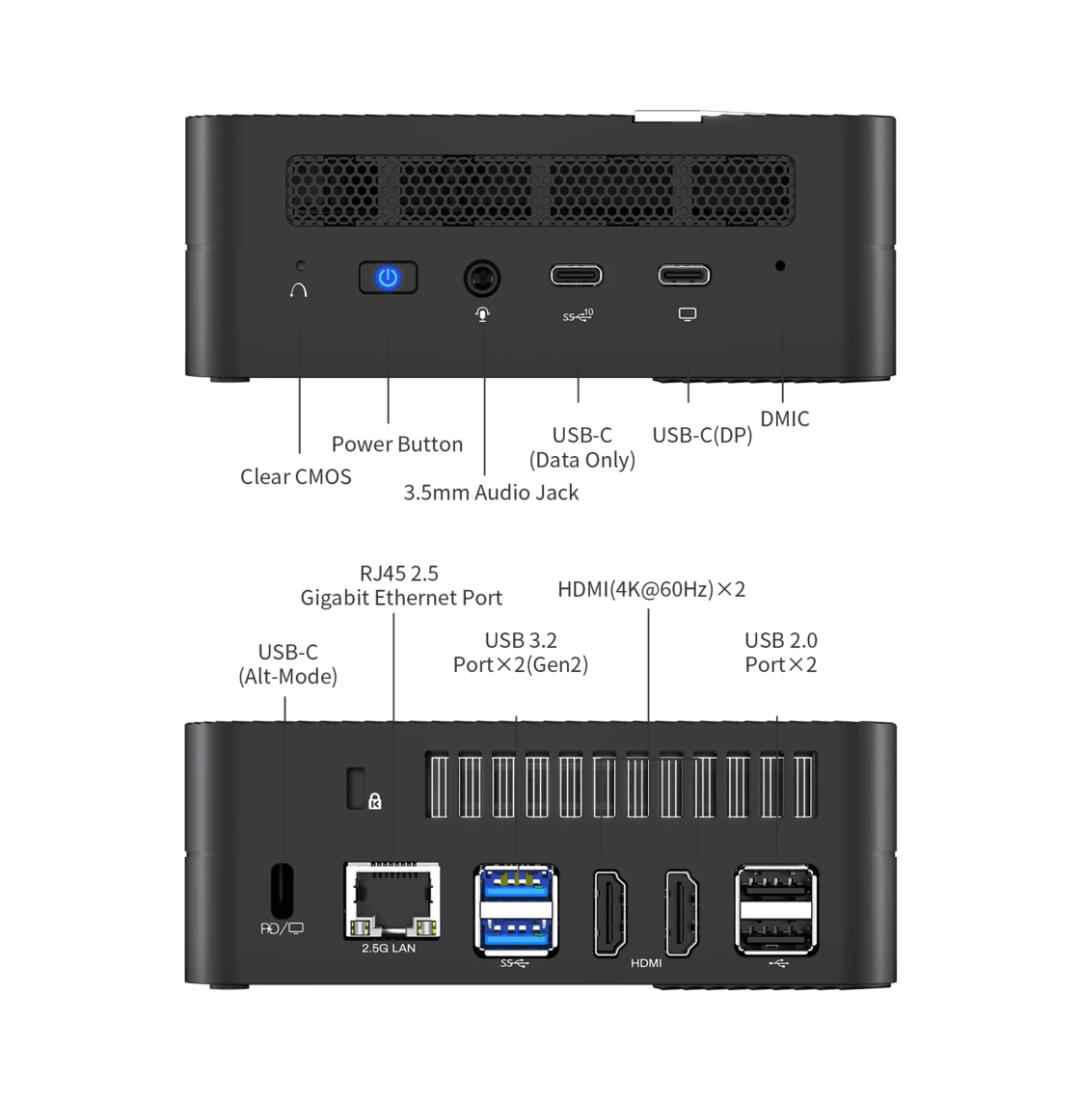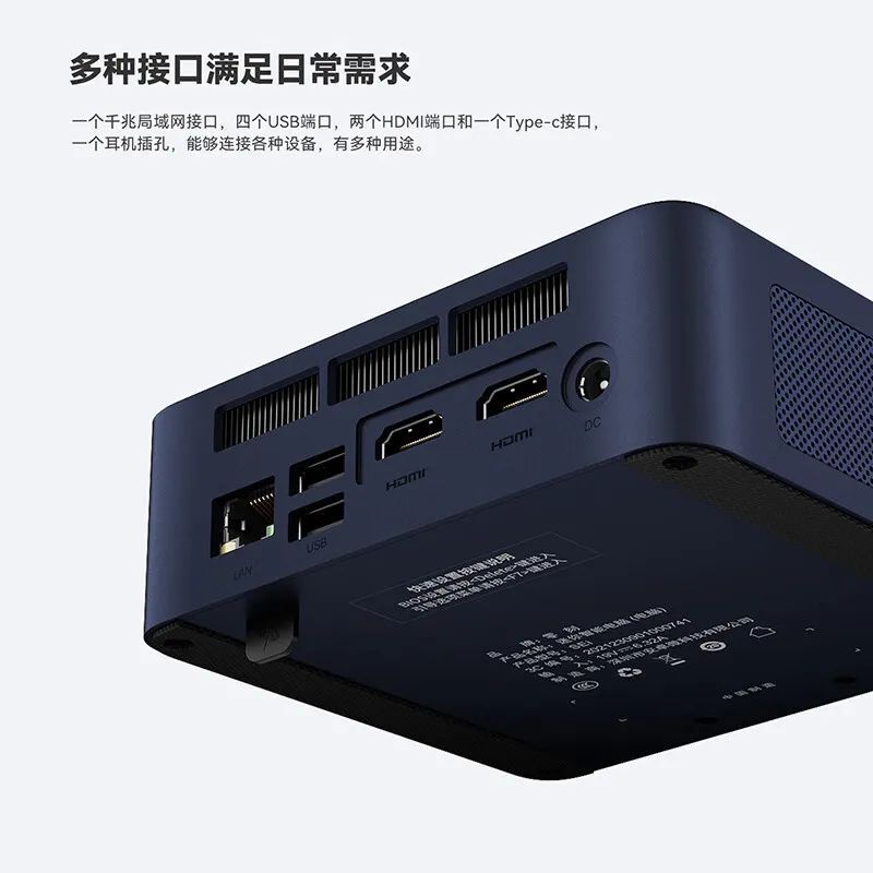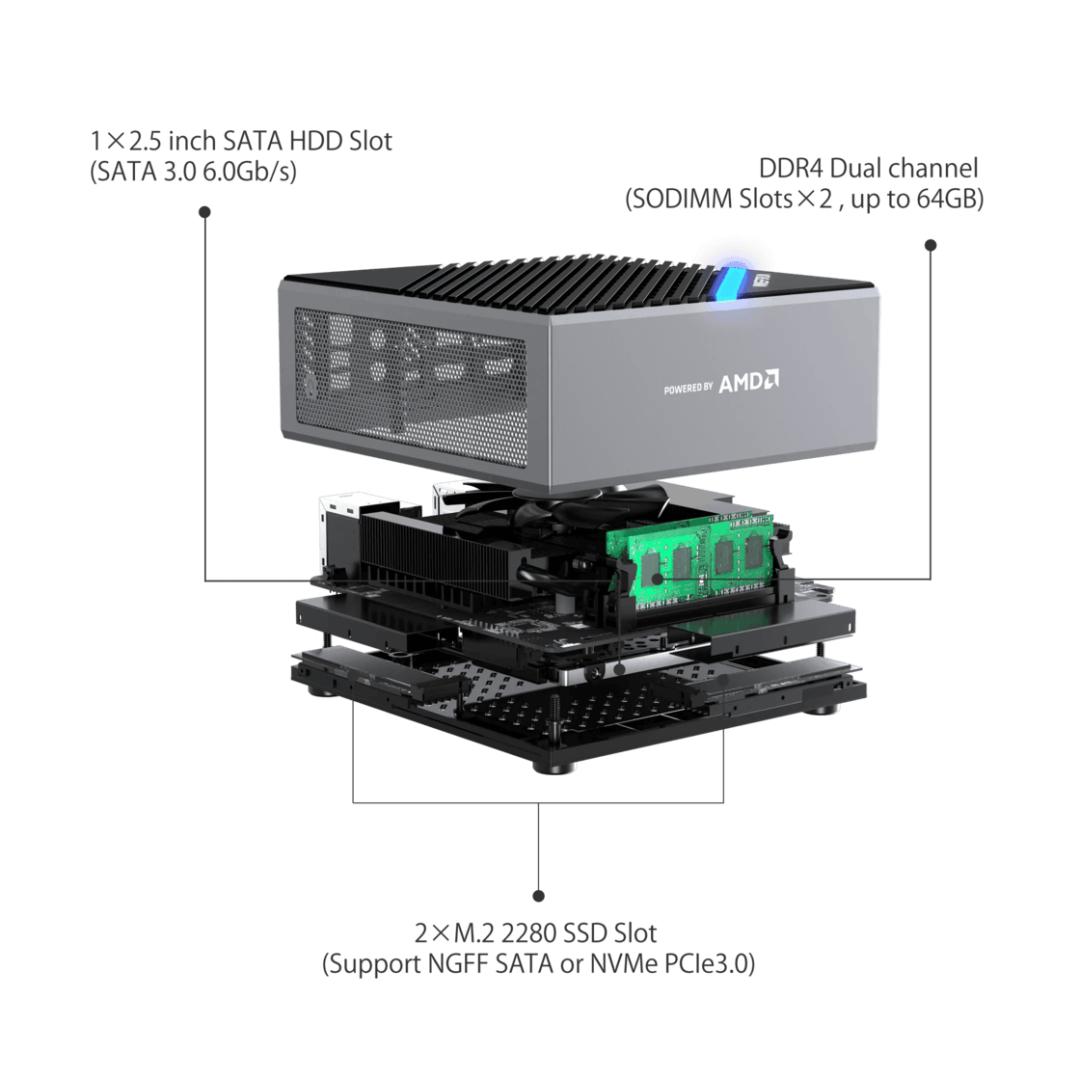 其他的扩展上包括内存和存储,内存支持双通道的 DDR4-3200 笔记本内存,最大 64GB;存储上提供两个 M.2 2280 SSD 插槽以及一个 2.5 英寸 SATA 硬盘盘位;接口上也颇为丰富,一个 DP、两个 HDMI 输出,四个 USB 3.2 Gen 2 接口以及一个 USB- C(Gen 2) 接口。无硬盘无 CPU 无内存的售价为 1500 元左右。