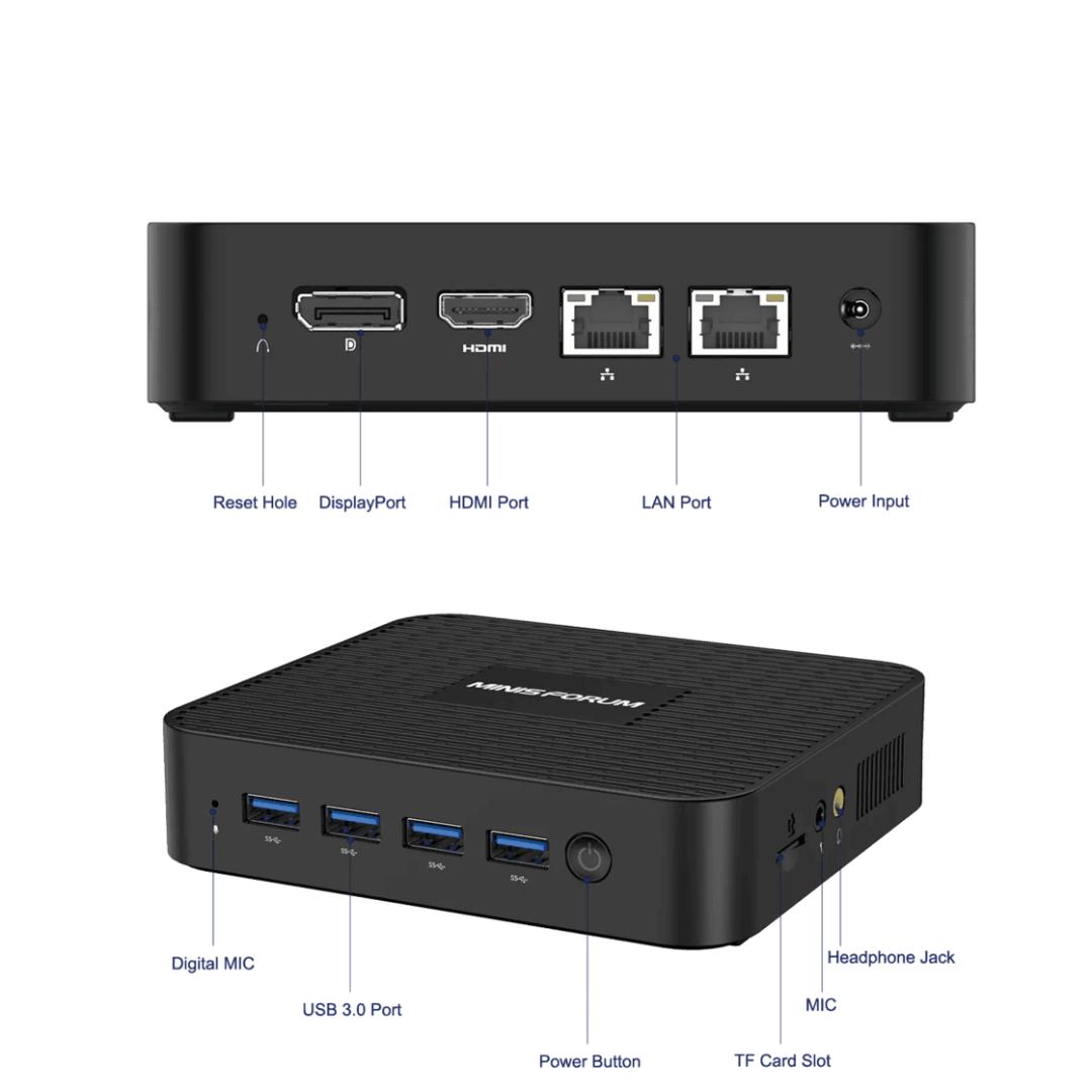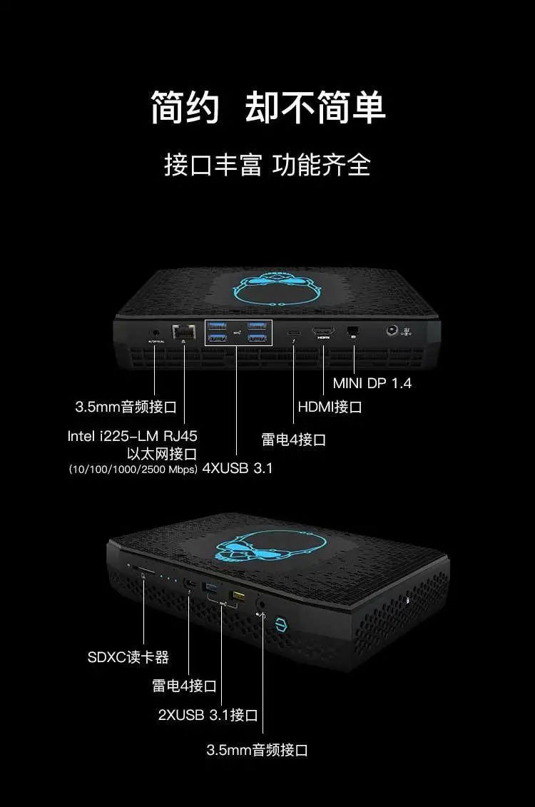 显示输出上,支持同时链接 4 个 4K 显示器,机身上原生有两个 HDMI 接口;扩展上,内存支持 DDR4 -3200 双通道笔记本内存;存储上提供了 NVMe M.2 以及 SATA3(7mm 厚度硬盘) 两接口。现在电商平台上无硬盘和内存的准系统版本售价在 2000 元左右。