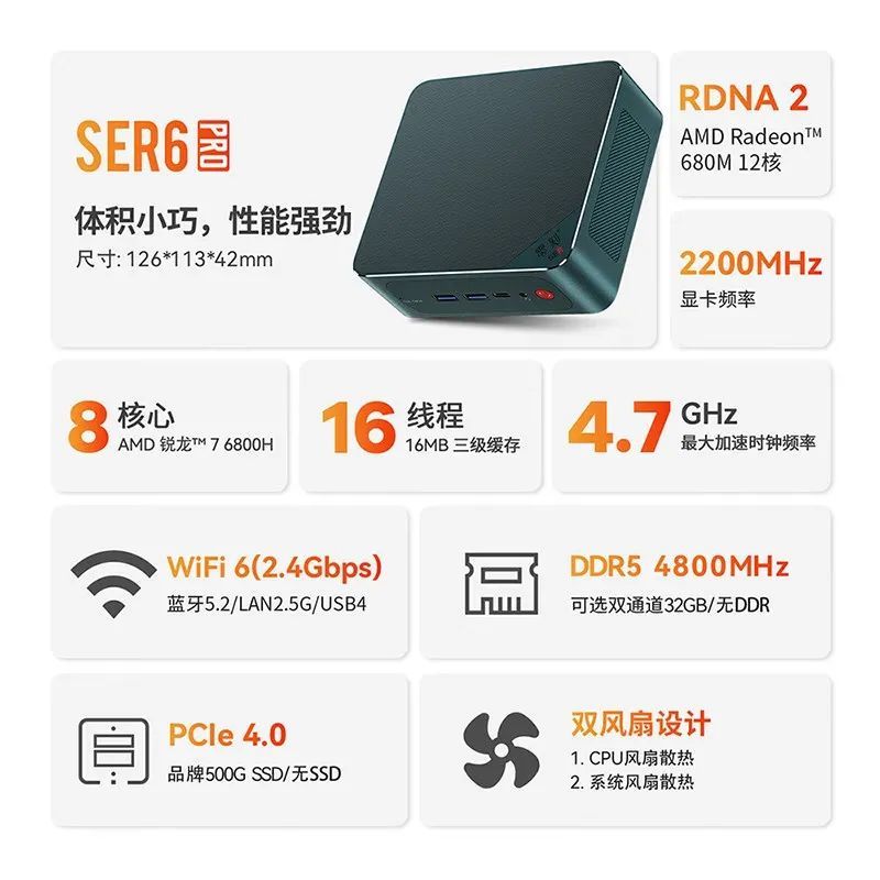 AMD 处理器具有更强的性价比,对应的就是可以在一定的价格范围内直接把性能拉满,比如说零刻 SER6 Pro 就采用了 AMD 锐龙 R7-6800H 处理器,8 核 16 线程,对应的核显则是 Radeon 680M,显卡频率直接上到 2200MHz,所以对于一些进阶办公中可能会遇到的高性能图形计算也能胜任。甚至你可以将其作为轻度的游戏主机使用。