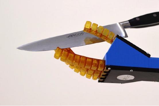 研发人员也通过一个用于抓取物体的机器手爪进行测试,经过一整天的融合,受到刀伤的机器手爪最终成功实现了自我修复。