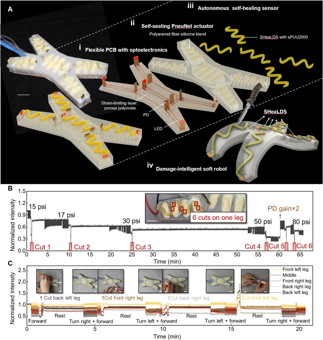 这种SHeaLDS技术(self-healing light guides for dynamic sensing)正是使一个抗损伤的软体机器人能够在室温下自我愈合伤口的关键,而无需任何外部干预。