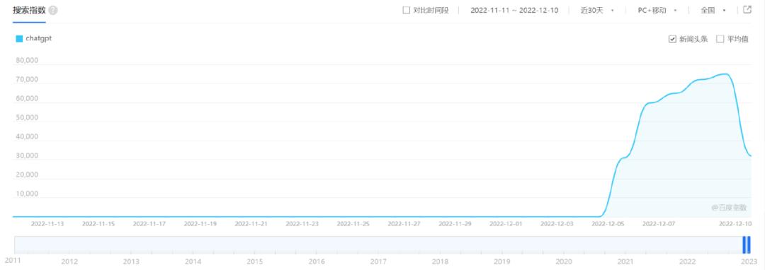 尽管这款产品的注册流程对于国内用户来说存在一定的门槛,但这并没有影响我们对ChatGPT的热情。百度指数显示,从上周一开始,ChatGPT的相关搜索数据就在火速上升。