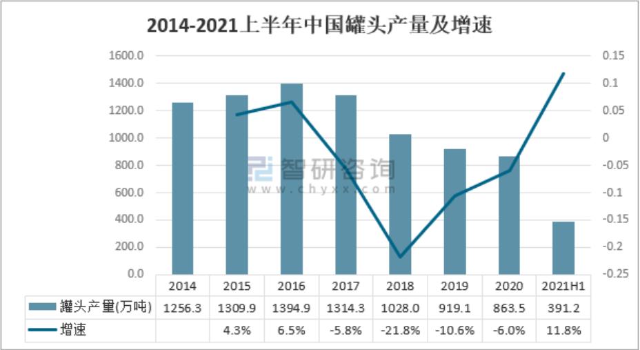 2020年开始,在疫情影响下,不少消费者有了“囤货”的习惯。保质期长、营养丰富的罐头成了囤货时的重要“物资”,逐年萎缩的罐头行业也出现回暖的迹象。智研咨询数据显示,2021年上半年,我国罐头产量同比增长11.8%,这也是2017年来首次出现增长。