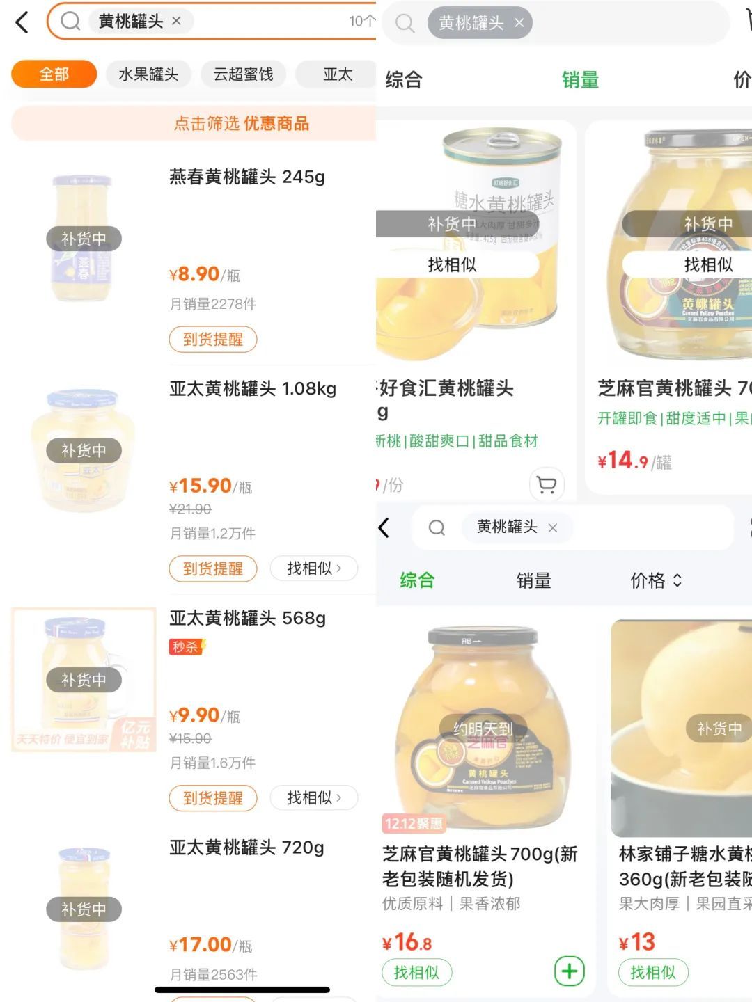 一家黄桃罐头生产商告诉市界,他在拼多多经营的店铺,这两天黄桃罐头销量直接翻倍了。另一个黄桃罐头品牌的京东自营店直接被抢空了,“上次出现被抢光的情形还是在2020年。”该品牌相关负责人表示。