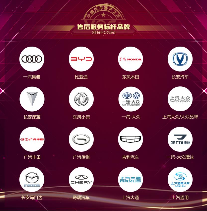 售后服务标杆品牌的获得者有(排名不分先后):一汽奥迪、比亚迪、东风本田、长安汽车、长安深蓝、东风小康、一汽-大众、上汽大众/大众品牌、广汽丰田、广汽传祺、吉利汽车、一汽-大众捷达、长安马自达、奇瑞汽车、上汽大通、上汽通用。