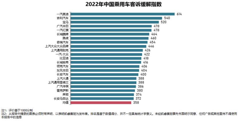 - 2022中国乘用车客诉缓解指数(CCRI)行业均值358分(千分制),连续两年下降。合资品牌降幅最大,近70分,自主品牌下降63.9分,豪华品牌提升25分。